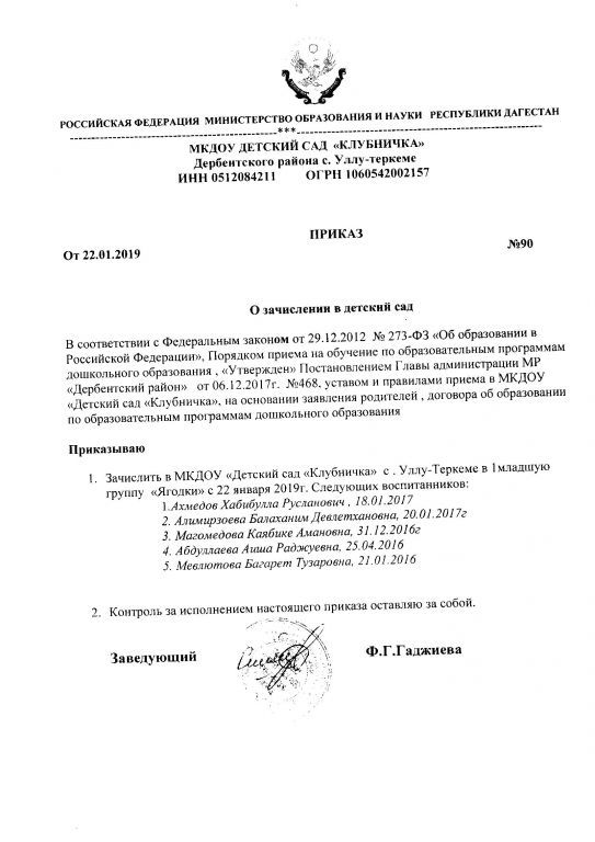 Распорядительный акт о зачислении ребенка в образовательную организацию
